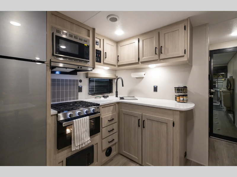 Sleeps 4 Length 29 ft 10 in Ext Width 8 ft Ext Height 10 ft 7 in Int Height 6 ft 9 in Hitch Weight 957 lbs GVWR 7900 lbs Dry Weight 5486 lbs Cargo Capacity 2414 lbs Fresh Water Capacity 44 gals Grey Water Capacity 40 gals Black Water Capacity 30 gals Furnace BTU 30000 btu Available Beds Queen Refrigerator Type GE Stainless 12V Refrigerator Size 10.7 cu ft Cooktop Burners 3 Shower Size 34" x 34" Number of Awnings 1 LP Tank Capacity 20 lbs Water Heater Type Tankless AC BTU 13500 btu Awning Info 15' Electric with Multi-Color Lights Axle Count 2 Number of LP Tanks 2 Shower Type Radius Electrical Service 30 amp Similar Floorplans