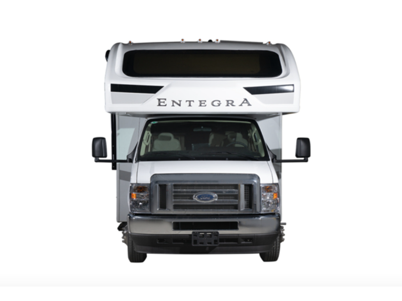 Each is equipped with E-Z Drive which is a computer-balanced driveshaft, with standard front and rear stabilizer bars, Hellwig helper springs, and rubber isolation body mounts. Some construction features include a one-piece, seamless fiberglass front cap with an automotive-bonded panoramic window and power shade, TuffShell vacuum-bond laminated sidewalls and floor, plus bead-foam insulation. The interior offers a custom-molded ABS surround in the cab-over area with overhead bunk for extra sleeping space, an 84-inch ceiling height for spacious living, LED-lit kitchen countertops, and the Entegra-exclusive easy-operation legless dinette table for more leg room.