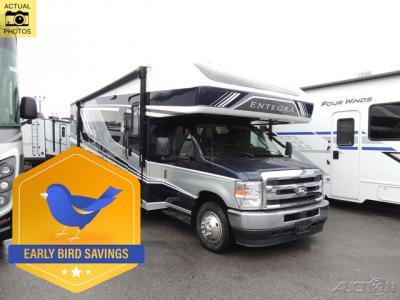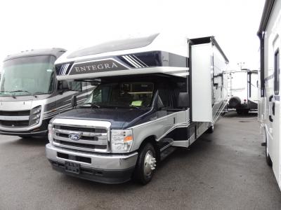 Each is built on a Ford E-450 chassis, and is equipped with E-Z Drive which is a computer-balanced driveshaft, with standard front and rear stabilizer bars, Hellwig helper springs, and rubber isolation body mounts. Some construction features include a one-piece, seamless fiberglass front cap with an automotive-bonded panoramic window and power shade, TuffShell vacuum-bond laminated sidewalls and floor, plus bead-foam insulation. The interior offers a custom-molded ABS surround in the cab-over area with overhead bunk for extra sleeping space, an 84-inch ceiling height for spacious living, LED-lit kitchen countertops, and the Entegra-exclusive easy-operation legless dinette table for more leg room.