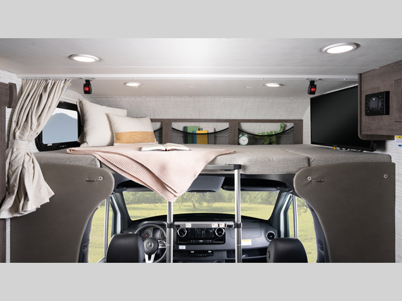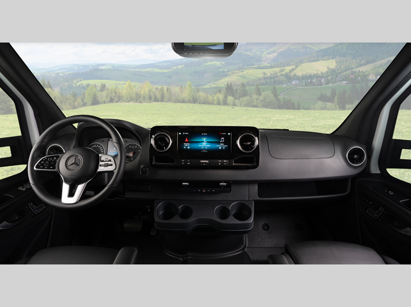 - One-piece seamless fiberglass front cap; Frameless windows; Heated holding tanks; Heated, remote-controlled side-view mirrors; Electric patio awning with LED lights; Backup and side-view cameras; Keyless cab entry; 7 in. integrated MBUX infotainment center; Swivel driver and passenger seats