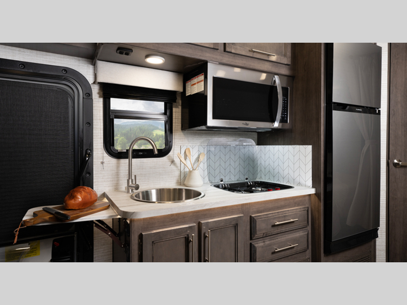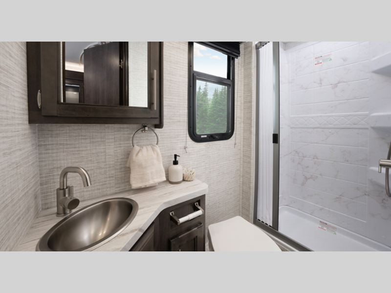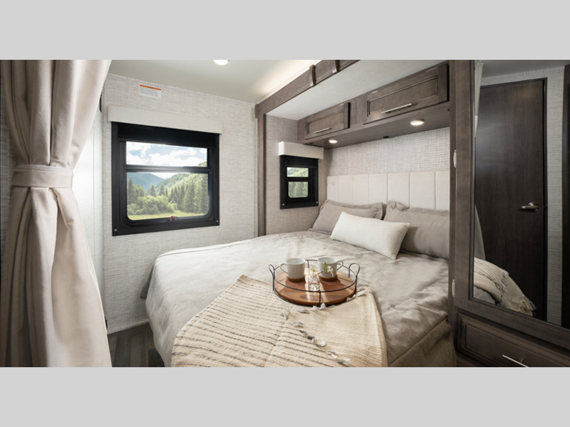 The TuffShell construction in the floor, roof, and walls will let you enjoy your RV for years to come, and the bead-foam insulation means you can travel even in colder seasons. There are sleek frameless windows outside, along with a fiberglass exterior with vinyl graphics, an exterior utility center, and convenient electric stabilizer jacks. Hardwood cabinet doors and pleated blackout shades will make your space feel more like home, plus there is a 6' 9" ceiling height that provides ample room to move about.