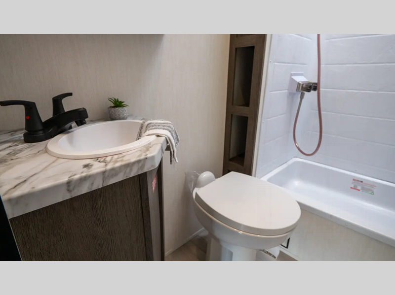 You will love the real wood cabinet doors and drawers inside, along with LED lights and a black stainless steel farm sink that will have you feeling more at home. There are power stabilizer jacks to make your RV more secure, and the power awning with LED accent lighting will create an outdoor space campground neighbors will want to check out.