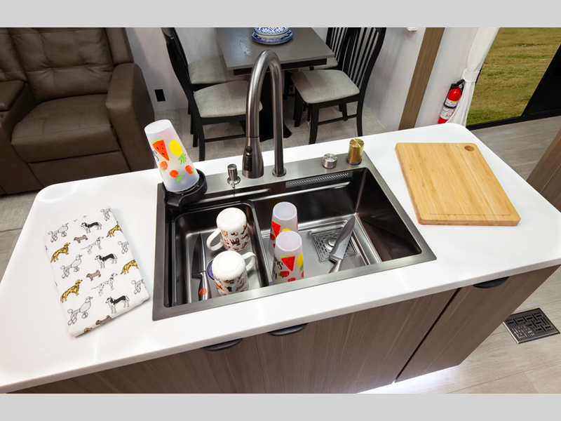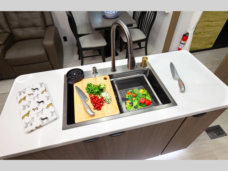 You will love the residential features, such as a Serta mattress in the bedroom, stainless steel kitchen appliances, and solid surface countertops. There are also adjustable textured roller shades, a 60k on-demand tankless water heater, and a 106" interior height in the living room for added space. Outside, 4K awning "Blade Lighting" will keep your space well illuminated, while JBL speakers let you listen to your favorite tunes.