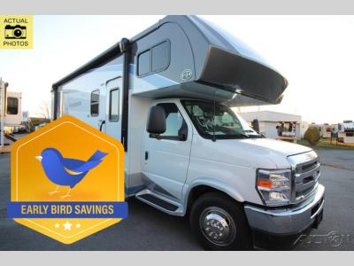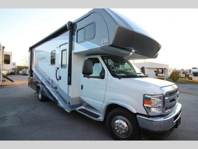 Sleeps 6 Slides 2 Length 27 ft 1 in Ext Width 8 ft 5 in Ext Height 11 ft 3 in Exterior Color Standard Graphics. Full-Body Paint; Pacific, Garnet GVWR 14500 lbs Fresh Water Capacity 44 gals Grey Water Capacity 39 gals Black Water Capacity 39 gals Furnace BTU 30000 btu Generator 4.0 kW Gas Fuel Type Gasoline Chassis Ford Fuel Capacity 55 gals Wheelbase 182 in Number Of Bunks 1 Available Beds RV Queen Refrigerator Type 12V Refrigerator Size 10.7 cu ft Convection Cooking Yes Cooktop Burners 3 Shower Size 24" x 36" Number of Awnings 1 Axle Weight Front 5000 lbs Axle Weight Rear 9600 lbs LP Tank Capacity 41 lbs Water Heater Capacity 6 gal Water Heater Type DSI Gas/Electric AC BTU 15000 btu TV Info LR 12V LED TV, BR 12V TV Awning Info 18' Power w/LED Light Strip Gross Combined Weight 22000 lbs Shower Type Standard Electrical Service 30 amp Similar Motor Home Class C Floorplans