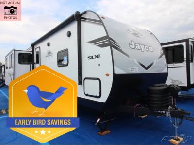 The Jayco Jay Flight SLX travel trailer is quite easy to own because it is lightweight for an easier towing experience. Built on a fully integrated A-frame with galvanized-steel, impact-resistant wheel wells, the Jay Flight SLX has quality at its very foundation. That quality continues on to the electric self-adjusting brakes, easy-lube hubs, Magnum Truss roof system, and LP quick connect. Some of what the mandatory Customer Value Package includes is backup camera prep, Keyed-Alike entry and baggage doors, and an on-demand tankless water heater.