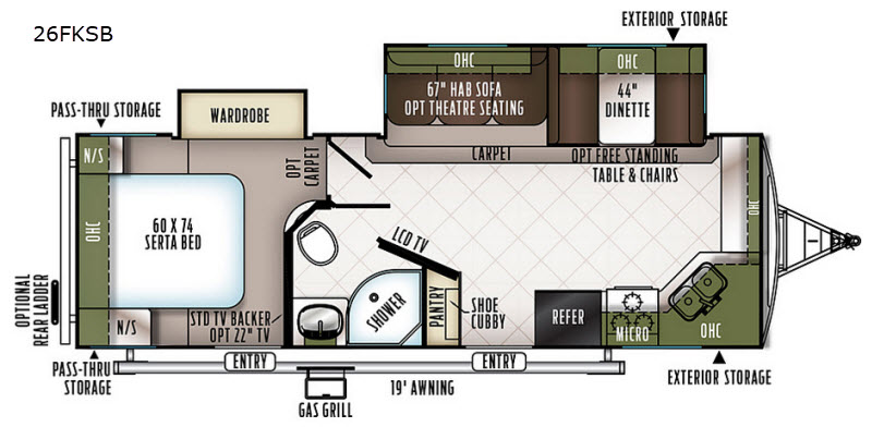 This double slide out Flagstaff Super Lite 26FKSB is ideal for any couple or family with young children. You will enjoy a large exterior pass through storage area, plus there is a 19' power awning with a light strip so now you can plan to stay outside just a little bit longer in the evening once the sun has set. Inside this model you will find a spacious kitchen area with plenty of counter space and overhead cabinets. With two entry doors you can either enter into the living room/kitchen area or into the rear bedroom.